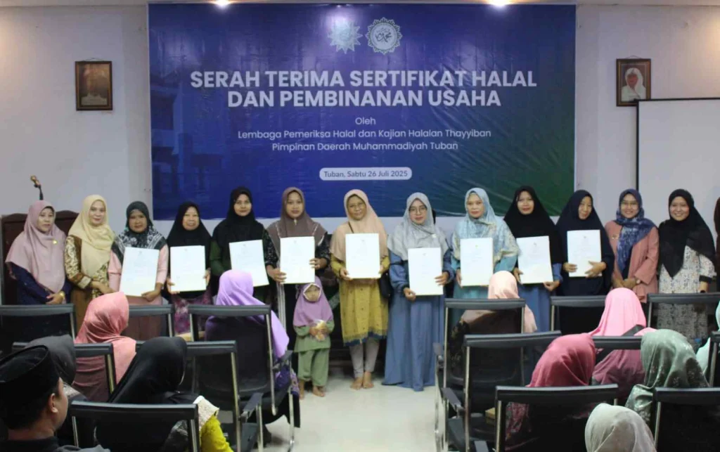 Sebanyak 130 pelaku Usaha Mikro, Kecil, dan Menengah (UMKM) di Kabupaten Tuban menerima sertifikat halal dari Lembaga Pemeriksa Halal dan Kajian Halalan Thoiyibah (LPH-KHT) Muhammadiyah pada Sabtu (26/7/2025) di Gedung Dakwah Muhammadiyah Tuban. Seremoni penyerahan sertifikat berlangsung khidmat namun sarat makna.