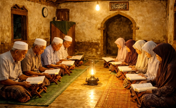 Yang terdengar hanya halaman mushaf dibalik, suara serak menahan kantuk, dan sesekali gumaman pelan memperbaiki bacaan. Di sudut ruangan, teh manis panas dan kental dengan kue-kue menjadi hidangan. Seseorang membawa gorengan dan kue yang dibagi dalam setiap meja.