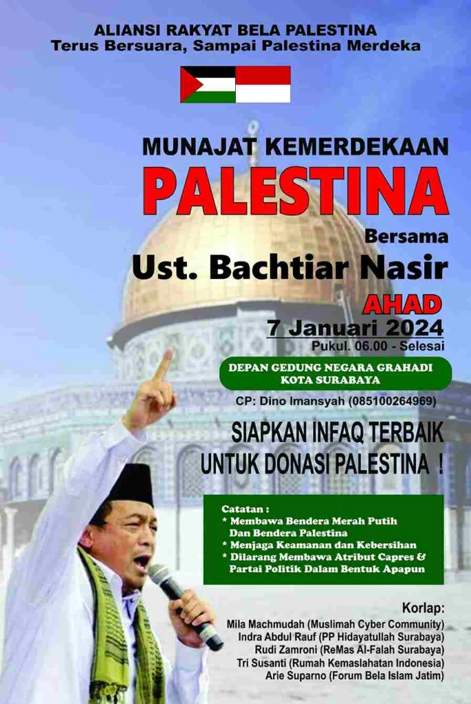 Setelah mengadakan Aksi Bela Palestina 12 Nopember 2023 lalu yang dihadiri oleh Gubernur Jawa Timur Khofiah Indar Parawansa, Aliansi Rakyat Bela Palestina kembali akan menggelar kegiatan Munajat Kemerdekaan Palestina Bersama Ustad Bachtiar Nasir, LC, MM.