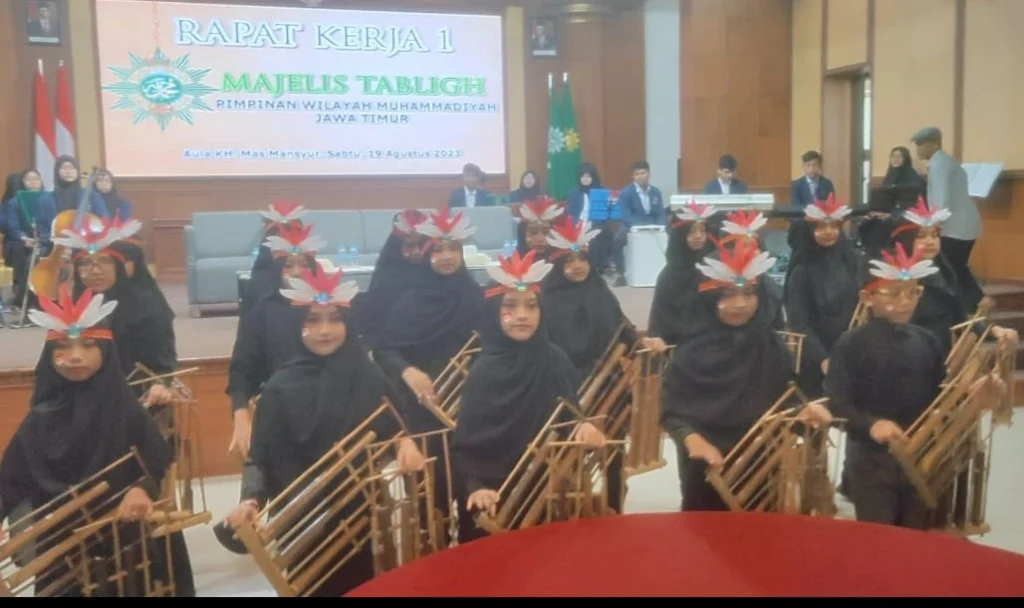 Penampilan parade angklung dari SD Muhammadiyah 6 (Musix) Gadung Surabaya ikut memeriahkan acara Rapat Kerja Wilayah (Rakerwil) 1 Majelis Tabligh PWM Jatim yang dilaksanakan di Aula KH Mas Mansur PWM Jatim, Sabtu (19/8/23).
