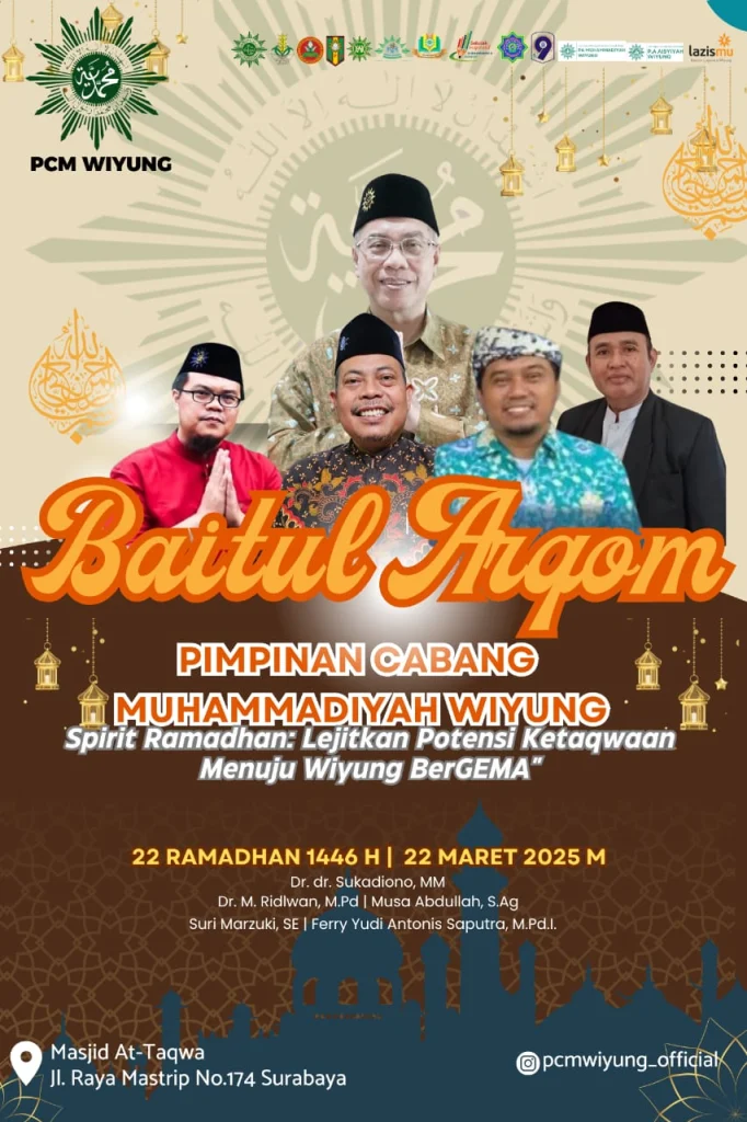 Dalam rangka menyemarakkan bulan suci Ramadhan 1446 Hijriah, Pimpinan Cabang Muhammadiyah (PCM) Wiyung, Surabaya, menyelenggarakan Baitul Arqom dengan tema “Spirit Ramadhan: Lejitkan Potensi Ketaqwaan Menuju Wiyung Bergema”.
