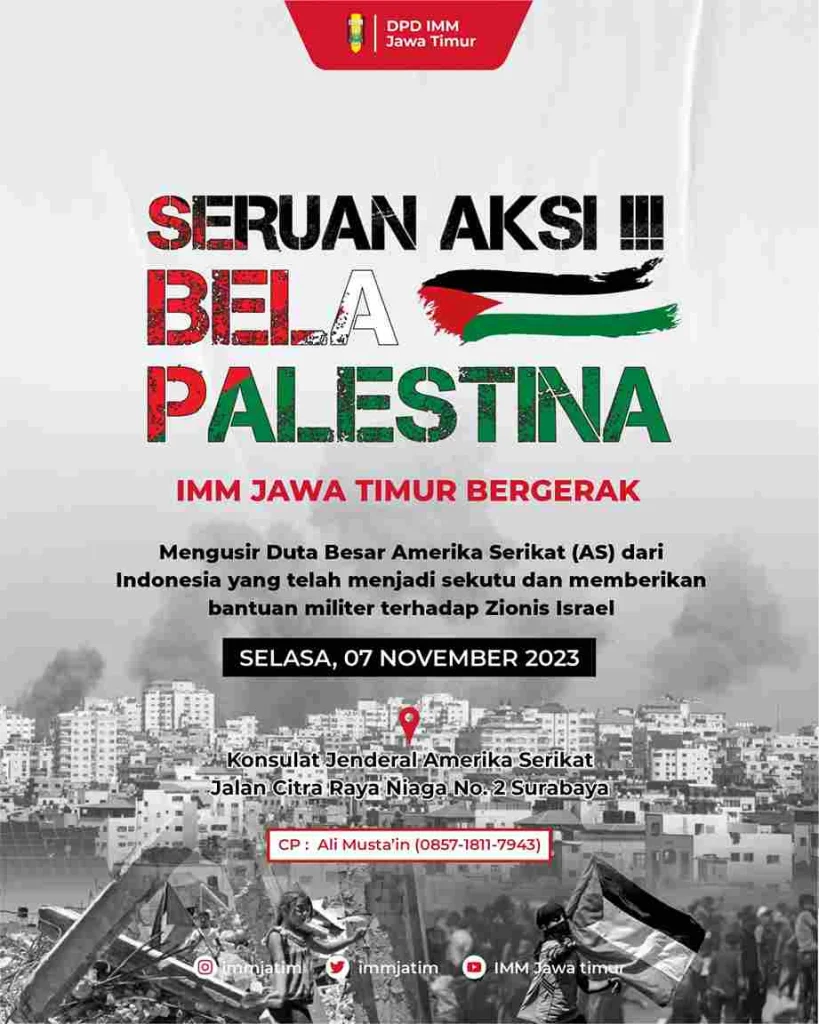 Dewan Perwakilan Daerah Ikatan Mahasiswa Muhammadiyah (IMM) Jawa Timur, akan menggelar aksi di depan Konsulat Jenderal (Konjen) Amerika Serikat (AS) pada Selasa (7/11/2023) besok. Mereka akan ‘mengepung’ Konjen AS untuk mengecam genosida yang dilakukan tentara Zionis Israel terhadap masyarakat sipil di Palestina.