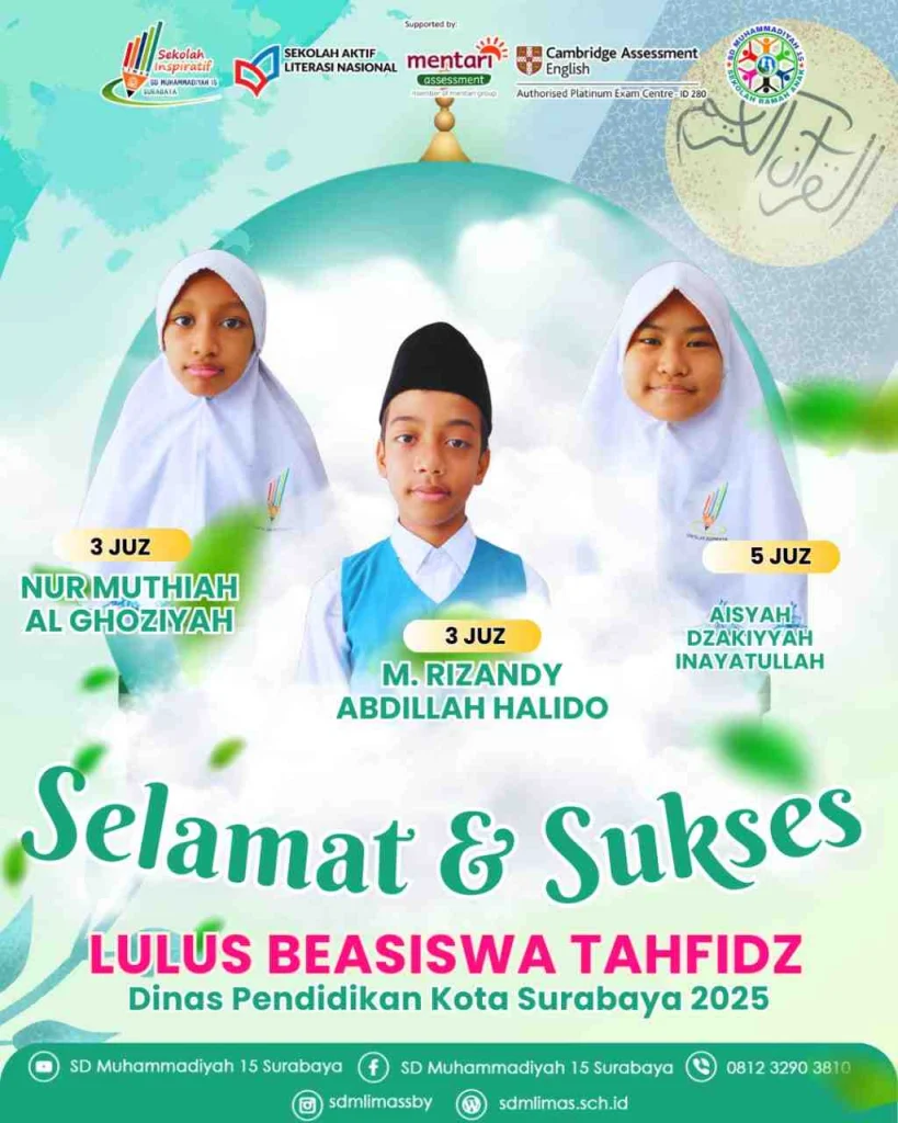 Sekolah Inspiratif SD Muhammadiyah 15 Surabaya (SDM Limas) merasa bangga karena berhasil mencetak generasi qurani yang menginspirasi. Tiga murid SDM Limas berhasil lolos seleksi penerima beasiswa penghafal Al Qur’an dari Dinas Pendidikan Kota Surabaya tahun 2025.