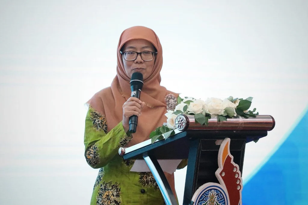 Ketua Umum Pimpinan Pusat ‘Aisyiyah Salmah Orbayinah sampaikan sambutan dalam Silaturahmi Idulfitri 1445 H Keluarga Besar Muhammadiyah pada Ahad (28/4) di Sportorium Universitas Muhammadiyah Yogyakarta (UMY).
