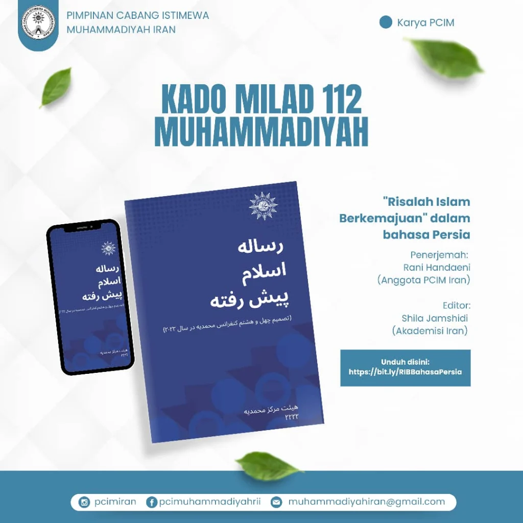 Pimpinan Cabang Istimewa Muhammadiyah (PCIM) Iran merayakan Milad Muhammadiyah ke-112 dengan menerjemahkan Buku Risalah Islam Berkemajuan (RIB) ke dalam bahasa Persia. Buku yang dihasilkan pada Muktamar Muhammadiyah ke-48 di Surakarta tahun 2022 ini selesai diterjemahkan tepat pada peringatan Milad Muhammadiyah, Ahad (18/11).