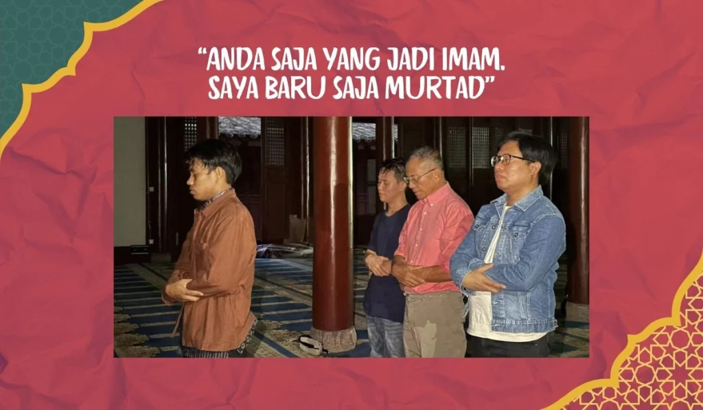 “Saya minta Alwi yang jadi imam. Namun, Alwi justru memaksa saya untuk menjadi imam. Terjadilah saling paksa,” tulis Pak DI seraya membisiki telinga Alwi, “Anda saja yang jadi imam. Saya baru saja murtad.”