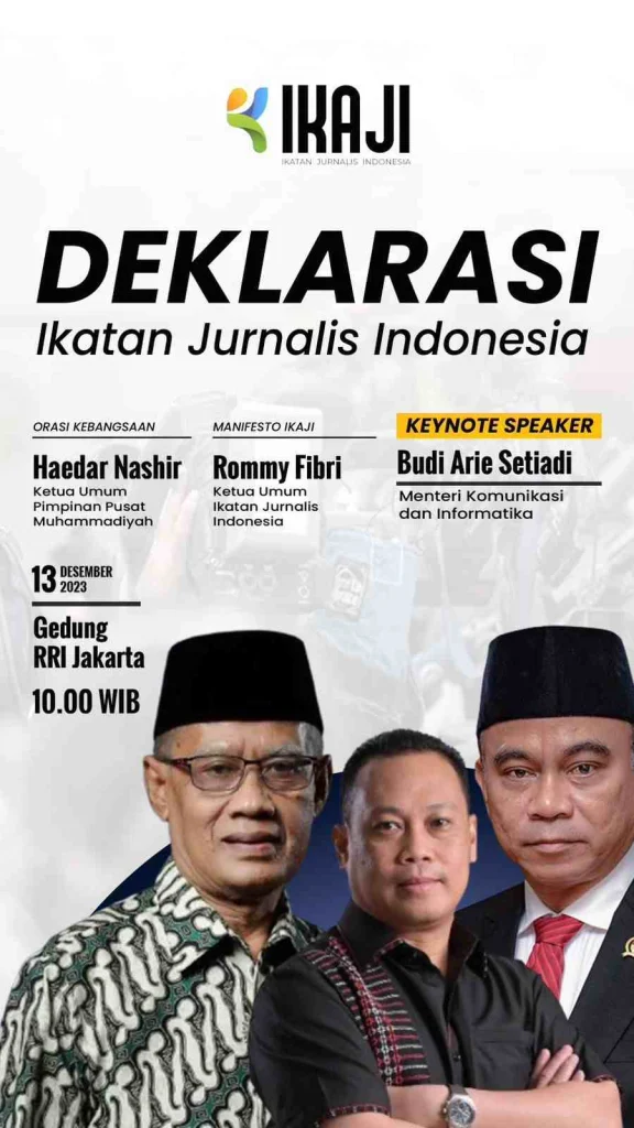 Sebagai organisasi baru, IKAJI akan secara resmi dideklarasikan Rabu (13/12/2023) di Gedung RRI Jakarta. Akan hadir tokoh bangsa yang juga Ketua Umum PP Muhammadiyah Haedar Nashir, Menteri Komunikasi dan Informatika Budi Arie Setiadi, Ketua Umum IKAJI Rommy Fibri, dan tokoh lainnya.