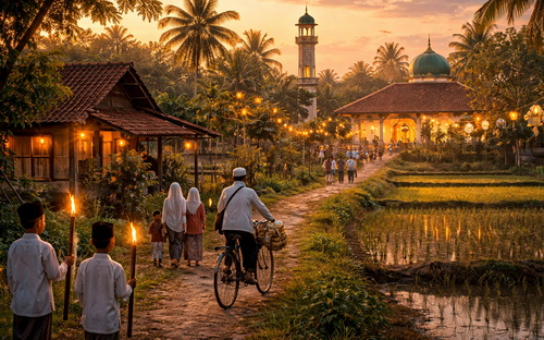 Masjid-masjid dipenuhi langkah yang pulang, seperti arus manusia menuju samudera. Doa-doa berlayar di udara malam, mencari langit yang menyimpan rahasia.