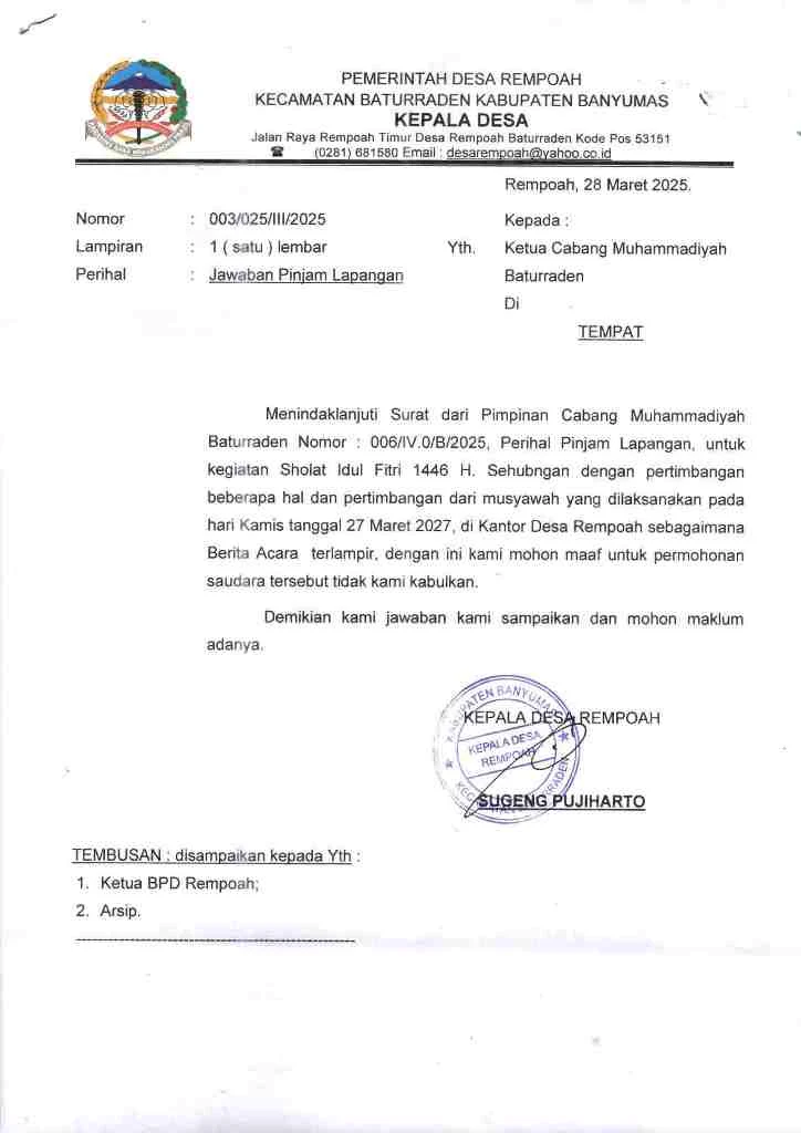Surat dengan nomor: 003/025/III/2025 ini menjadi tanggapan terhadap permohonan yang diajukan oleh PCM Baturraden dengan nomor: 006/IV.0/B/2025 perihal peminjaman lapangan untuk kegiatan Idul Fitri. Berita acara ini ditandatangani oleh Kepala Desa Rempoah, Ketua BPD Rempoah, perangkat desa, dan 11 takmir masjid yang ada di Desa Rempoah pada tanggal 27 Maret 2025.