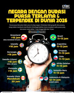 Letak geografis yang berbeda membuat durasi puasa Ramadan berbeda-beda di setiap negara. Ada yang panjang pada siang hari dan sebaliknya. Mengutip media Daily Sabah, Jumat (20/2/2026), umat Muslim di berbagai belahan dunia akan berpuasa rata-rata sekitar 12 hingga 15 jam perhari.