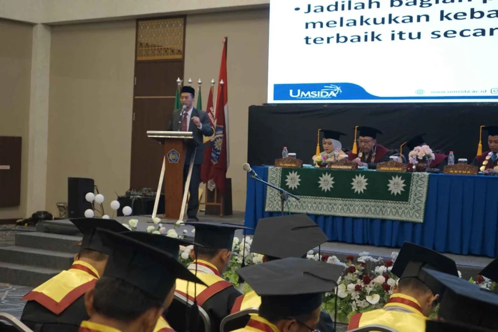 Wakil Ketua Pimpinan Wilayah Muhammadiyah Jawa Timur (PWM Jatim) itu mengawali orasinya dengan memberikan ucapan selamat kepada seluruh wisudawan.