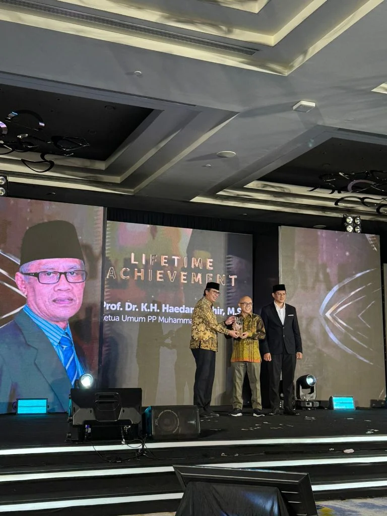 Ketua Umum Pimpinan Pusat Muhammadiyah Prof. Haedar Nashir menerima penghargaan Lifetime Achievement Award 2024 dari Rumah Zakat dalam acara Public Expose Rumah Zakat 2025, pada Kamis (13/2/2025).