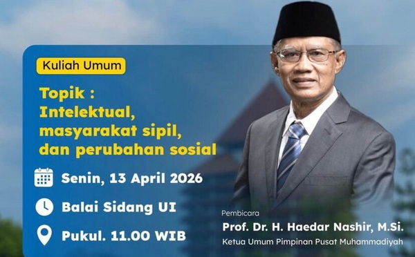 Ketua Umum Pimpinan Pusat Muhammadiyah, Haedar Nashir, dijadwalkan menyampaikan Kuliah Umum dengan tema “Intelektual, Masyarakat Sipil, dan Perubahan Sosial” pada Senin, 13 April 2026. Kegiatan ini akan berlangsung mulai pukul 11.00 WIB di Balai Sidang Universitas Indonesia (UI).