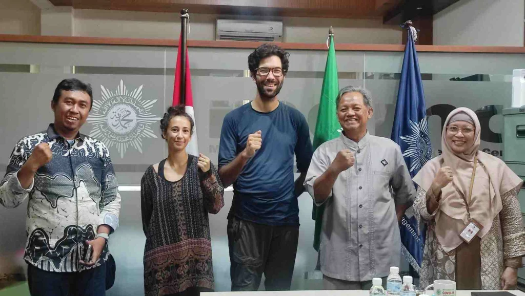 Kantor MDMC PP Muhammadiyah Gedung Muhammadiyah Jalan KHA Dahlan Yogyakarta menerima kunjungan dua orang pekerja hak asasi manusia (HAM) asal Swedia, Senin (11/12/2023). Mereka adalah Benjamin Ladraa dan Sanna Ghotbi yang telah bersepeda selama 2,5 tahun ke 18 negara.
