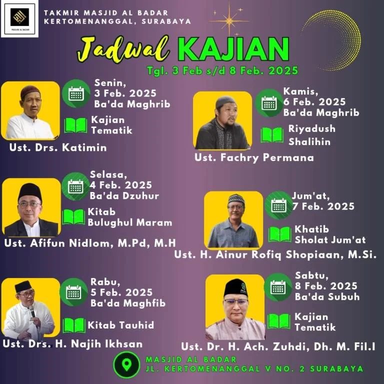 Masjid Al Badar Kertomenanggal Surabaya kembali menggelar kajian rutin yang berlangsung pada 3-8 Februari 2025. Kajian ini menghadirkan sejumlah ulama dan akademisi yang akan membahas berbagai tema keislaman, mulai dari kajian kitab hingga pembahasan tematik yang relevan dengan kehidupan umat.