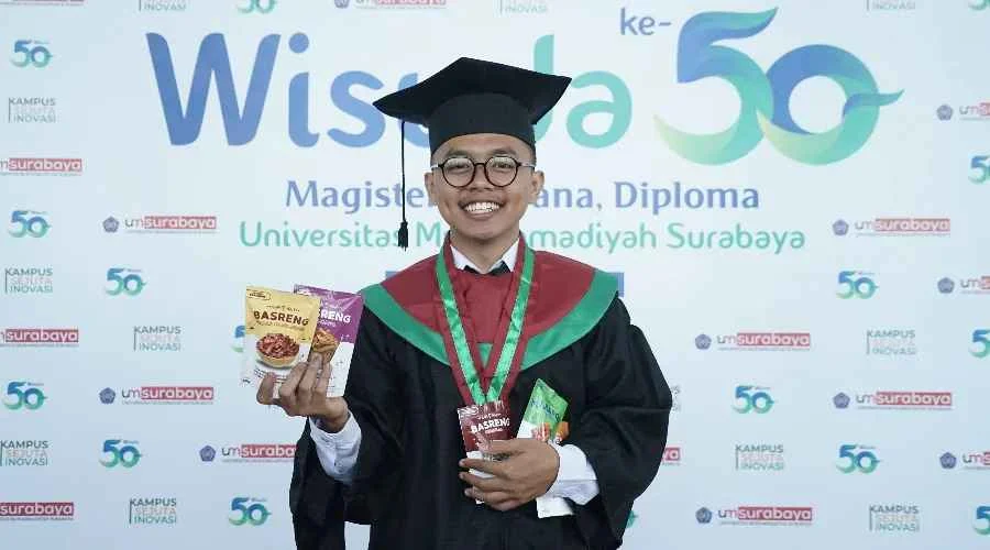 Wisudawan Universitas Muhammadiyah Surabaya (UM Surabaya) Moch. Abdullah Faqih sukses menjadi wisudawan yang memiliki usaha cemilan basreng yang diproduksinya secara sendiri. Sebagai mahasiswa sekaligus pengusaha muda, ia punya prinsip lebih baik jatuh berkali-kali dan berusaha bangkit daripada tidak pernah jatuh sama sekali
