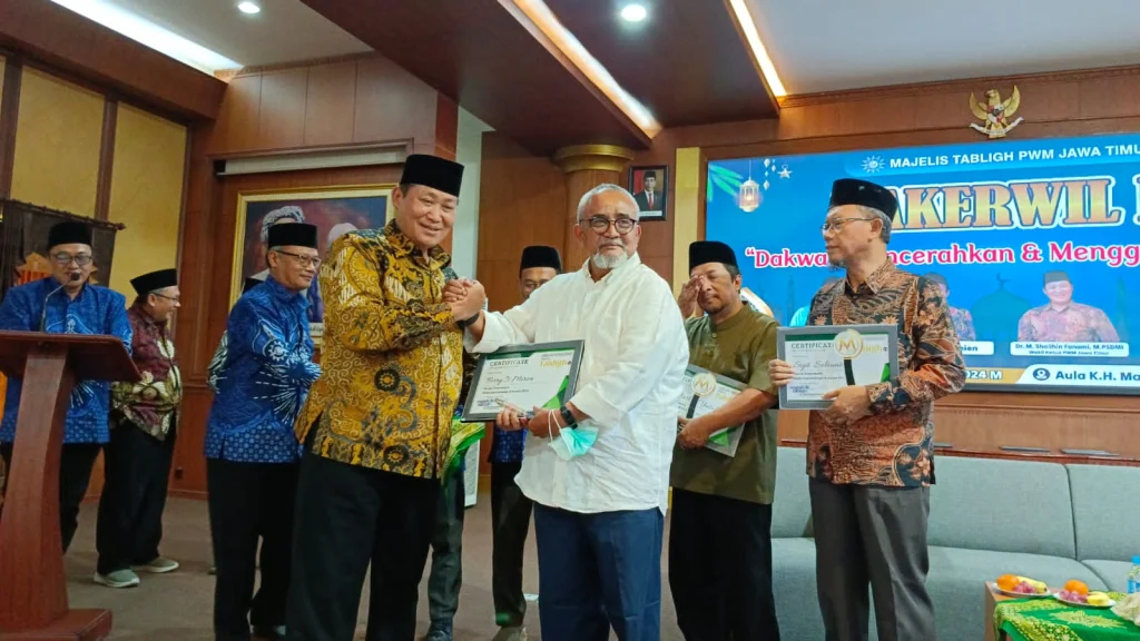 Saat menerima penghargaan, Kamis (23/5/2024) lalu, hadir Ketua Majelis Tabligh PP Muhammadiyah Fathurrahman Kamal Lc, MSi, Wakil Ketua PWM Jatim Dr. M. Sulthon Amien, Wakil Ketua PWM Jatim Dr. Sholihin Fanani, dan Ketua Majelis Tabligh PWM Jatim Abdul Basith Lc, MPdI.