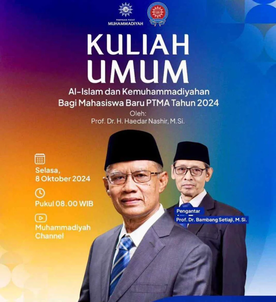 Mahasiswa baru Perguruan Tinggi Muhammadiyah-Aisyiyah (PTM/PTMA) 2024/2025 seluruh Indonesia hari ini, Selasa (8/10/2024) mengikuti Kuliah Umum Al Islam dan Ke muhammadiyaham yang digelar secara daring.