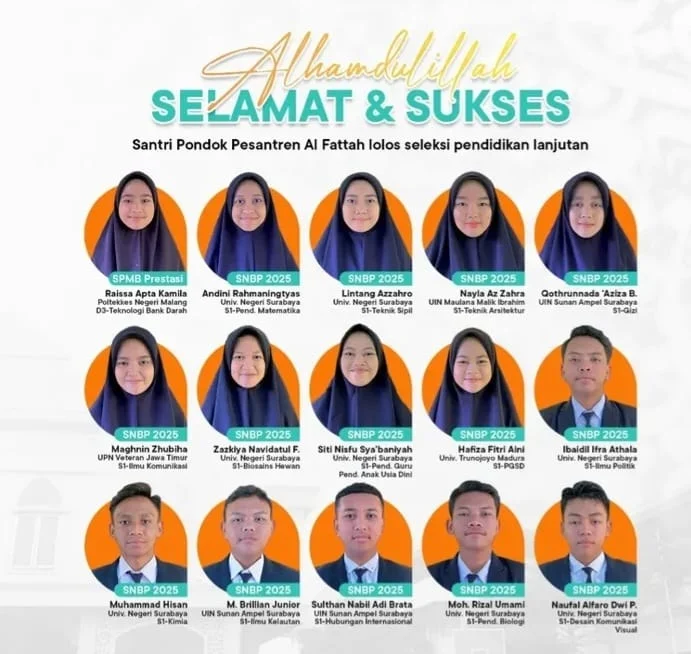 Kabar menggembirakan datang dari Pondok Pesantren Al Fattah Sidoarjo. Sebanyak 14 dari 15 siswa eligible berhasil lolos Seleksi Nasional Berdasarkan Prestasi (SNBP) 2025, mencatatkan tingkat kelulusan mengesankan sebesar 93,33%. Capaian ini menjadi bukti nyata bahwa santri tidak hanya unggul dalam bidang keagamaan, tetapi juga memiliki prestasi akademik yang luar biasa.