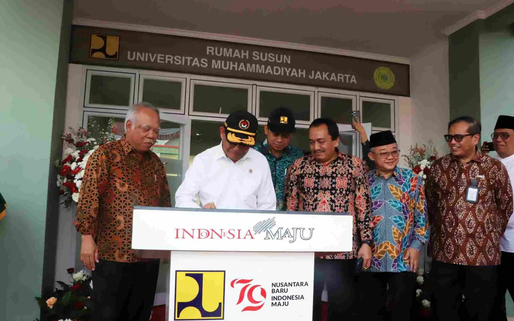 Menteri Koordinator Bidang Pembangunan Manusia dan Kebudayaan (Menko PMK) Muhadjir Effendy meresmikan rumah susun Universitas Muhammadiyah Jakarta (Rusun UMJ) Bantuan dari Kementerian PUPR, di Kawasan Kampus UMJ Ciputat, Tangerang Selatan, Banten, pada Jumat (30/8/2024).