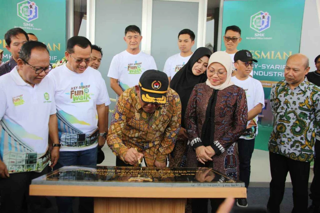 Menteri Koordinator Bidang Pembangunan Manusia dan Kebudayaan (Menko PMK) Muhadjir Effendy meresmikan SMK Asy-Syarif Mitra Industri Mojokerto yang merupakan hasil dari komitmen bersama antara pihak sekolah, pemerintah daerah, dunia industri, dan masyarakat dalam memajukan pendidikan vokasi di Mojokerto, pada Minggu (15/9/2024).