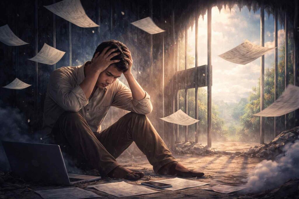 Fenomena ini layak dianalogikan sebagai “penjara tanpa jeruji”, sebuah metafora yang merepresentasikan keterkungkungan psikologis tanpa batas fisik yang kasatmata. Individu tetap menjalankan fungsi sosialnya secara normal, namun secara internal mengalami keterjebakan dalam pusaran kecemasan yang berulang, yang secara perlahan menggerus kemampuan untuk menghayati momen kekinian secara utuh.