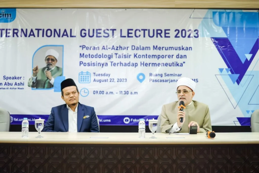 Guru Besar Ilmu Alquran dan Tafsir Universitas Al-Azhar Mesir Prof Dr Muhammad Salim Abu Ashi menjeadi keynote speaker dalam International Guest Lecture bertajuk “Peran Al-Azhar Dalam Merumuskan Metodologi Tafsir Kontemporer Dan Posisinya Terhadap Hermeneutika” di Universitas Muhammadiyah Surakartam (UMS), Selasa (22/8/2023).