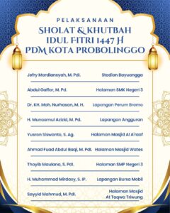 Pimpinan Daerah Muhammadiyah (PDM) Kabupaten Probolinggo dan Kota Probolinggo siap menggelar Salat Idulfitri 1447H pada 20 Maret 2026. Masing-masing daerah menyiapkan 9 titik lokasi salat untuk menyambut umat Muslim yang akan menunaikan Salat Idulfitri.