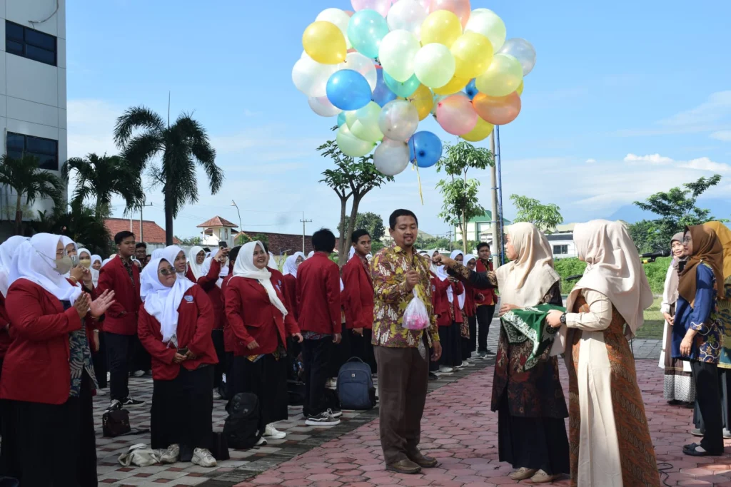 Pelepasan mahasiswa PLP 1 di tandai dengan pemotongan pita dan pelepasan balon yang diiringi oleh tepuk tangan dan euforia seluruh peserta PLP. (arya bimantara)