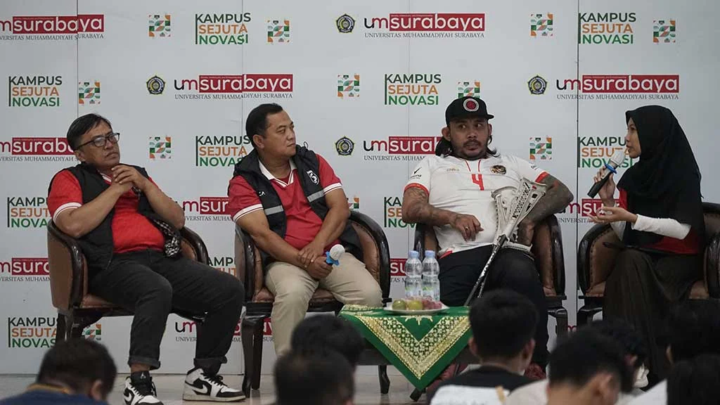 Para narasumber yang hadir, Ram Surahman (Sekretaris Persebaya Surabaya), Agus Wahyudi (jurnalis senior dan Ketua Divisi Dakwah Digital Majelis Tabligh PWM Jatim), serta Khusnul Yaqin (mahasiswa UM Surabaya dan pemain Timnas Garuda INAF Piala Dunia Amputasi Turkiye.