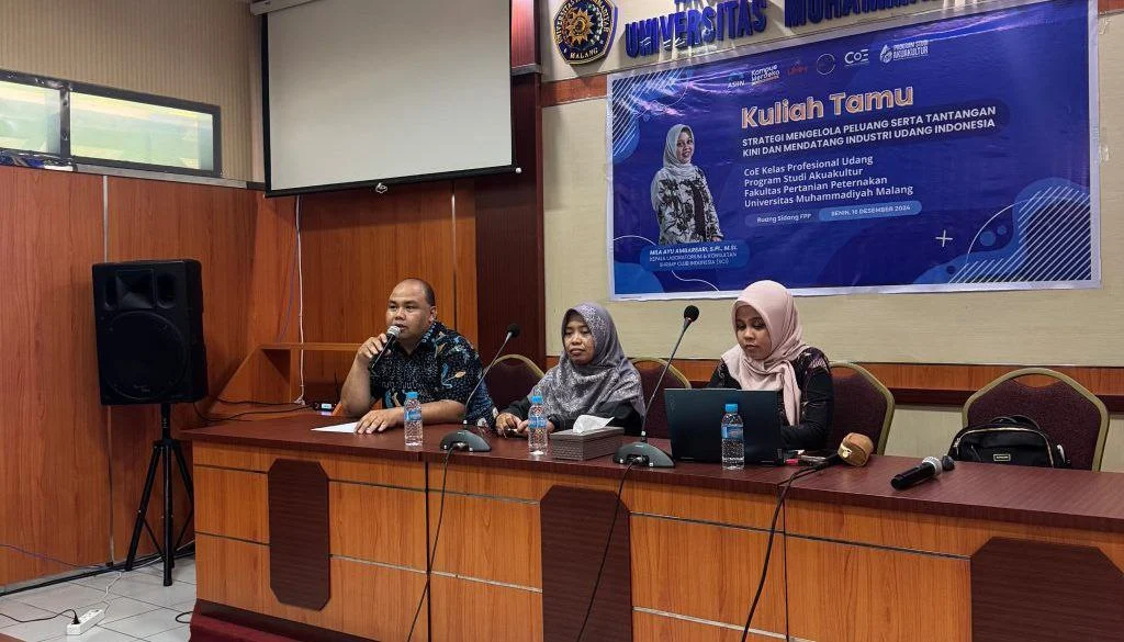 Untuk meningkatkan pengetahuan dan keterampilan mahasiswa di bidang udang, Program Studi Akuakultur Universitas Muhammadiyah Malang (UMM) mengundang pengurus Shrimp Club Indonesia dalam kuliah tamu yang digelar akhir Desember lalu.