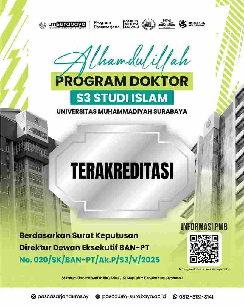 Prestasi membanggakan kembali diraih Universitas Muhammadiyah Surabaya (UMSurabaya). Berdasarkan Surat Keputusan Direktur Dewan Eksekutif BAN PT No. 020/SK/BAN-PT/Ak.P/S3/V/2025 Program Doktor (S3) Studi Islam (Islamic Studies) Pascasarjana Universitas Muhammdiyah Surabaya meraih status Terakreditasi.