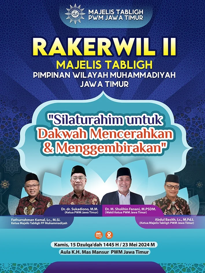 Majelis Tabligh Pimpinan Wilayah Muhammadiyah (PWM) Jatim bakal menyelenggarakan Rapat Kerja Wilayah (Rakerwil) II, Kamis (23/5/2024).