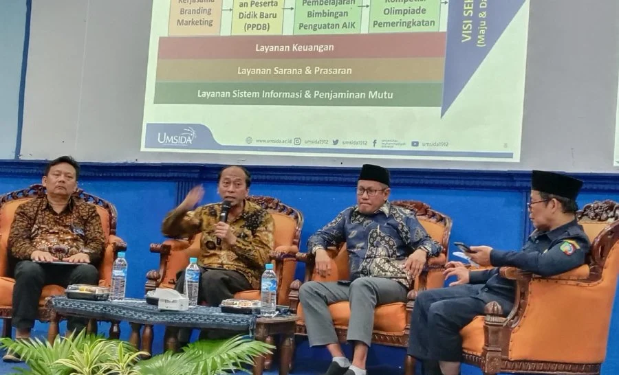 Rektor Universitas Muhammadiyah Sidoarjo (Umsida) Dr. Hidayatulloh memberikan materi tentang merencanakan kemajuan lembaga pendidikan di aula lantai 3 Rumah Sakit Muhammadiyah (RSM) Lamongan, Ahad (05/01/2025).