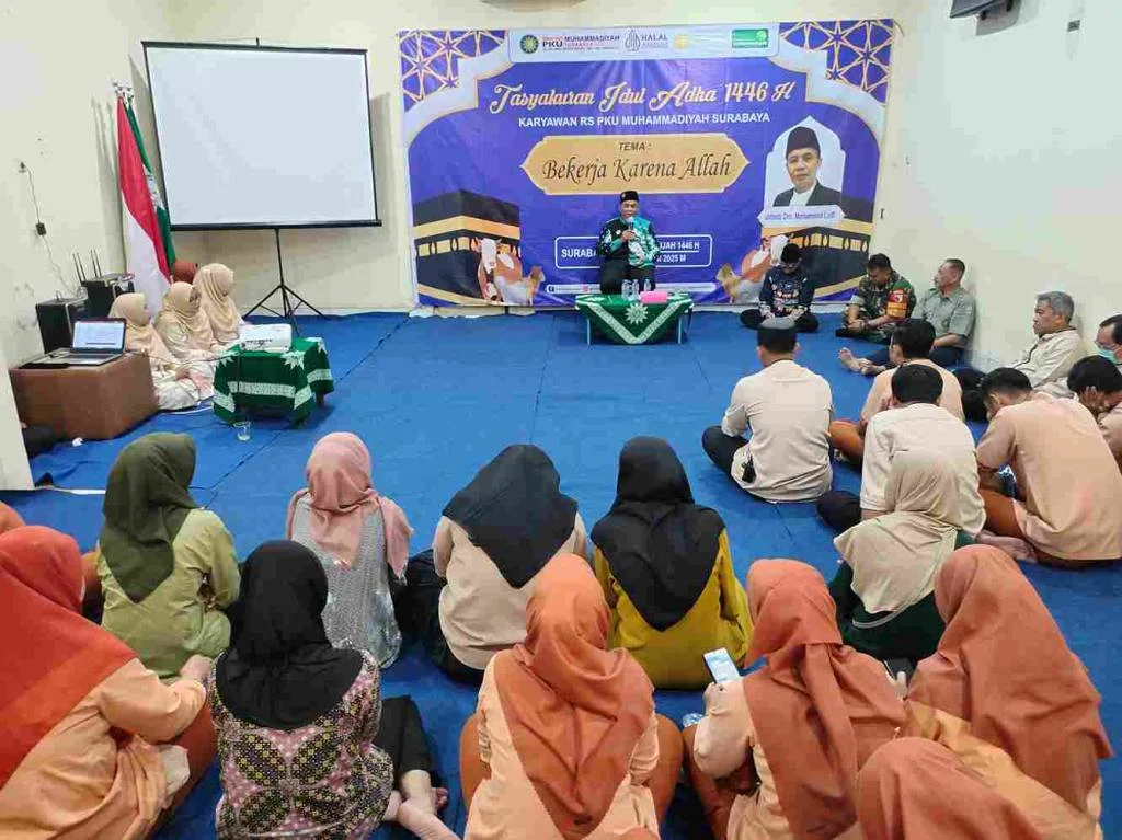 Memperingati Hari Raya Iduladha 1446 Hijriyah, RS PKU Muhammadiyah Surabaya mengadakan acara tasyakuran dengan tema “Bekerja karena Allah”. Kegiatan ini dihadiri oleh seluruh karyawan dan jajaran direksi rumah sakit, serta menghadirkan pemateri utama Ustaz Drs. Mohammad Lutfi