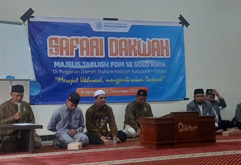 Majelis Tabligh Pimpinan Daerah Muhammadiyah (PDM) Solo Raya resmi membuka kegiatan Safari Dakwah yang dilaksanakan di Aula Masjid Raya Al Falah, Sragen, Sabtu (20/12/2025). Kegiatan ini diikuti oleh 30 mubaligh Muhammadiyah se-Solo Raya yang akan bertugas di 50 titik lokasi dakwah pada 20 Kecamatan di Kabupaten Sragen pada Sabtu-Ahad (20-21/12/2025).
