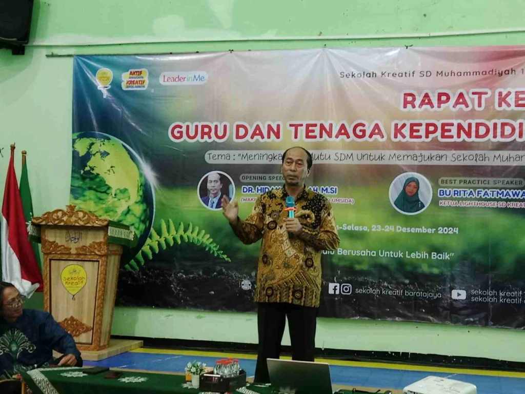 Rektor Universitas Muhammadiyah Sidoarjo (Umsida) Dr Hidayatulloh memaparkan materi terkait peningkatan mutu sumber daya manusia (SDM) untuk kemajuan sekolah Muhammadiyah pada kegiatan rapat kerja (raker) di Sekolah Kreatif SD Muhammadiyah 16 Surabaya, Selasa (24/12/2024).