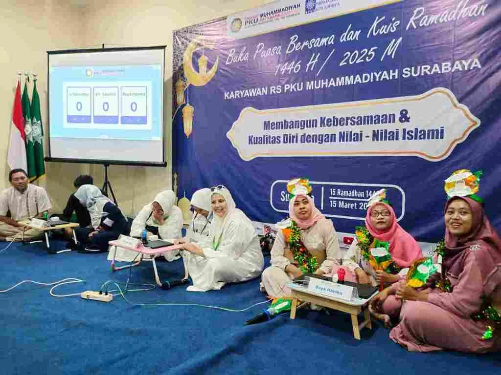Rumah Sakit PKU Muhammadiyah Surabaya sukses menggelar kegiatan buka bersama dan kuis Ramadan 1446 H dengan tema “Membangun Kebersamaan & Kualitas Diri dengan Nilai-Nilai Islami”. Kegiatan ini diikuti oleh seluruh unit rumah sakit, kecuali karyawan yang sedang bertugas sesuai dengan jadwal praktik. Acara berlangsung meriah dan penuh semangat kebersamaan.