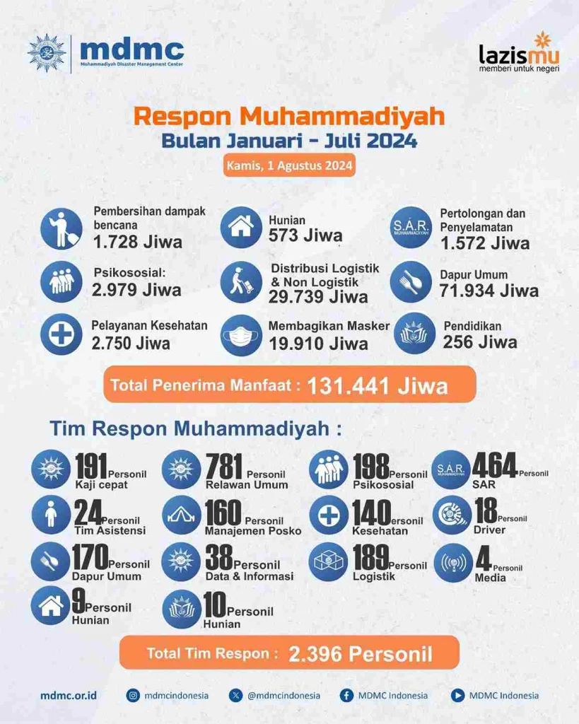 Sumber daya relawan yang diterjunkan oleh Muhammadiyah adalah relawan bencana terlatih sebanyak 2.396 personil. Dukungan sumber daya finansial yang dikelola oleh LazisMu hingga Juli 2024 dengan jumlah bantuan yang sudah disalurkan sebanyak Rp 1.328.200.400. Adapun jumlah penerima manfaat sebanyak 131.441 jiwa.