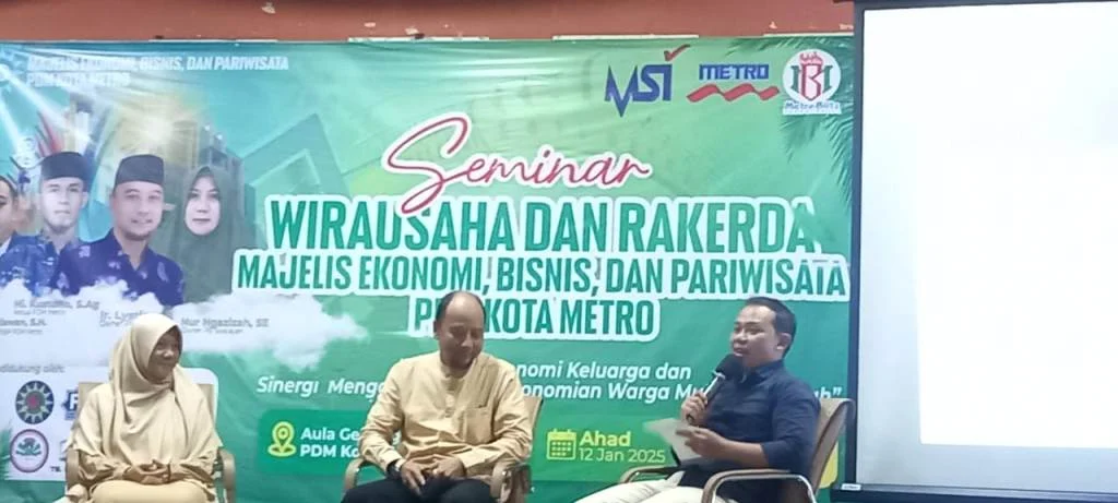 Majelis Ekonomi, Bisnis, dan Pariwisata (MEBP) PDM Kota Metro Lampung menyelenggarakan seminar kewirausahaan sekaligus rapat kerja daerah (Rakerda) dengan tema “Perkuat Ekonomi Keluarga dan Sinergi Menggerakkan Perekonomian Warga Muhammadiyah”.