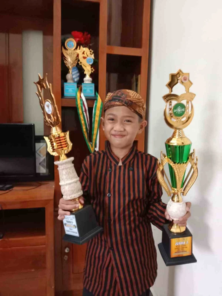 Ahmad Zafran Rais Al Alawi, siswa kelas 2 SD Muhammadiyah 1 Nganjuk memborong 3 piala kejuaraan berbeda dalam Lomba Pemilihan Dai Cilik (Pildacil) dalam rangkaian peringatan Hari Santri Nasional (HSN).