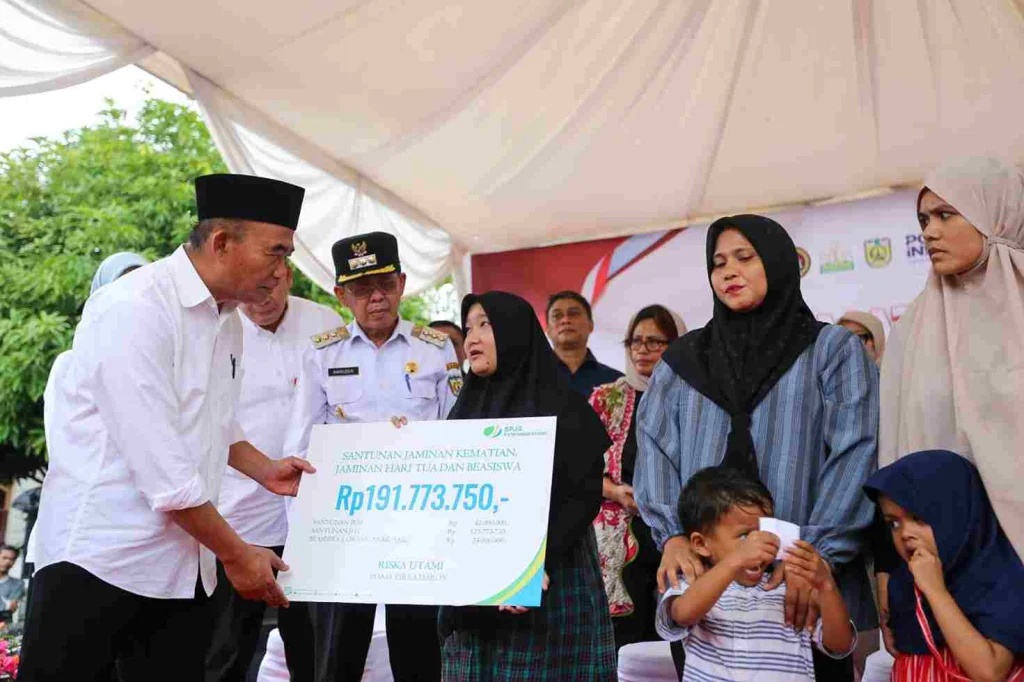 Menko PMK juga menyerahkan bantuan secara simbolis kepada penerima bantuan pangan beras CPP kepada dua KPM, memberikan bantuan sembako untuk dua keluarga yang memiliki anak stunting, dan simbolis pemberian santunan jaminan kematian.