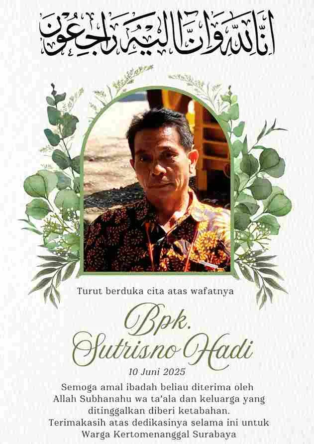 Duka mendalam menyelimuti keluarga besar Muhammadiyah Jawa Timur. Sutrisno Hadi, sosok sederhana namun penuh makna, wafat pada Selasa (10/6/2025). Almarhum telah mengabdikan diri sebagai marbot Masjid Al Badar di Kertomenanggal, Surabaya, selama lebih dari empat dekade. Ia wafat meninggalkan seorang istri, Mbak Wati, dan dua orang putri.