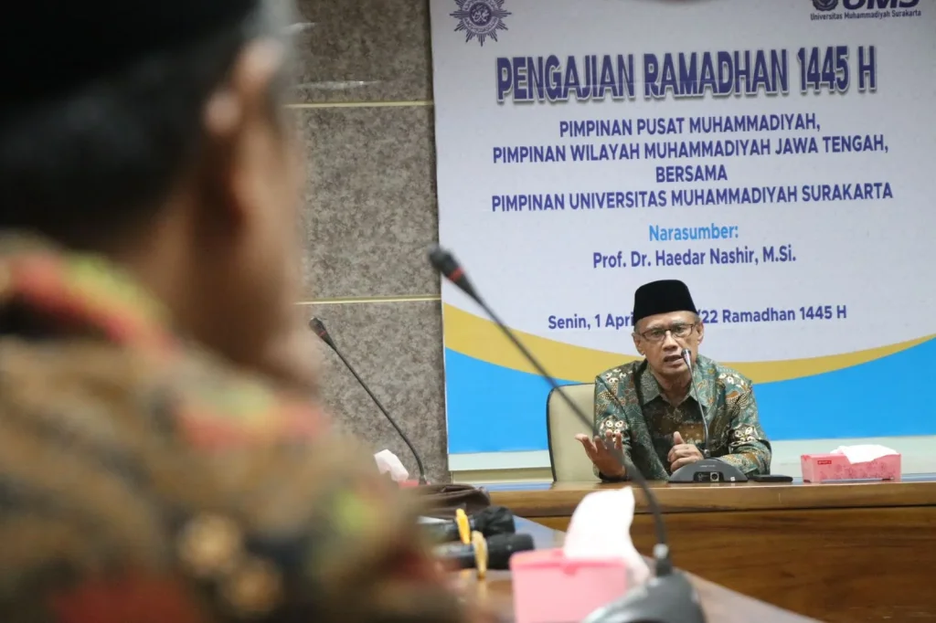 Ketua Umum Pimpinan Pusat (PP) Muhammadiyah Prof. Haedar Nashir melakukan kunjungan ke Universitas Muhammadiyah Surakarta (UMS) dalam rangka peresmian Gedung Pendidikan Profesi dan Pengajian Ramadan dan buka bersama, Senin (1/4/2024).