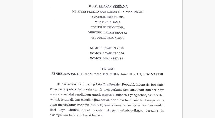Pemerintah telah mengeluarkan Surat Edaran Bersama (SEB) tentang Pembelajaran di bulan Ramadan Tahun 1447 H/2026 M. Surat tersebut ditandatangani oleh Menteri Pendidikan Nasional (Mendiknas) Abdul Mu’ti, Menteri Agama (Menag) Nasaruddin Umar, dan Menteri Dalam Negeri (Mendagri) Muhammad Tito Karnavian.