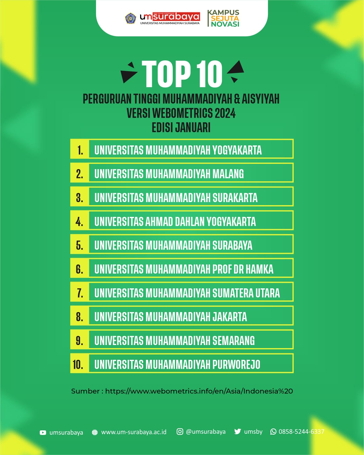 Berdasarkan pemeringkatan tersebut, Universitas Muhammadiyah Surabaya (UM Surabaya) menduduki peringkat ke-5 Kampus Perguruan Tinggi Muhammadiyah/Aisyiah (PTMA) terbaik di Indonesia.