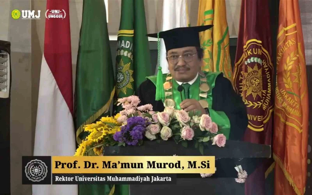 Rektor UMJ, Prof. Dr. Ma’mun Murod Al-Barbasy, MSi dalam sambutannya, menegaskan pentingnya peran lulusan dalam membangun budaya demokrasi yang berlandaskan nilai-nilai Islam.