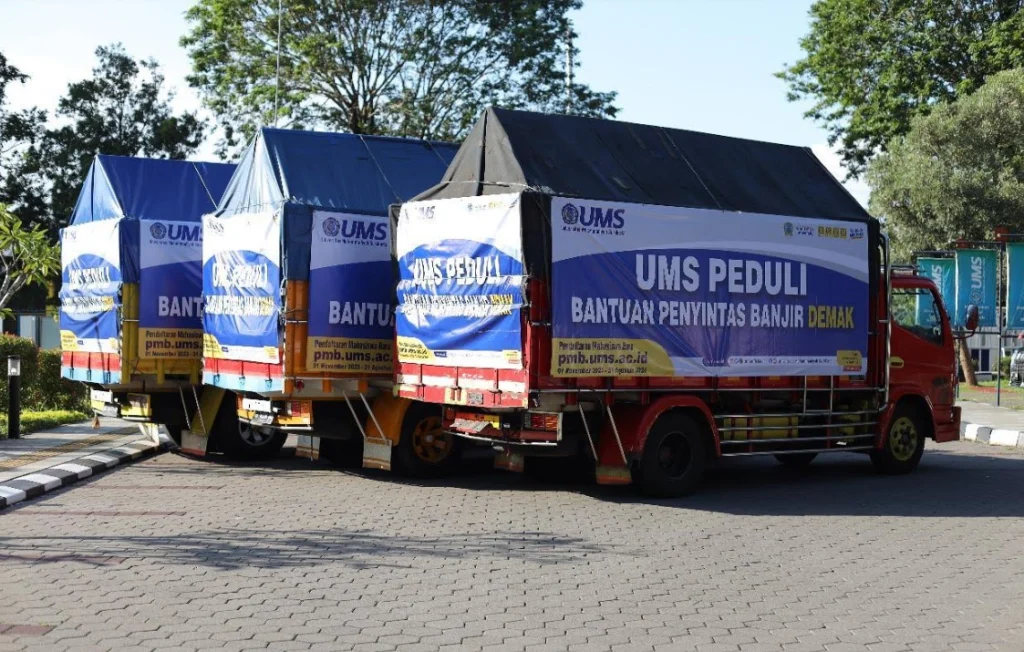 Universitas Muhammadiyah Surakarta (UMS) Peduli memberikan 1.500 paket bantuan untuk penyintas banjir Demak yang diangkut dengan 3 armada truk bantuan logistik.