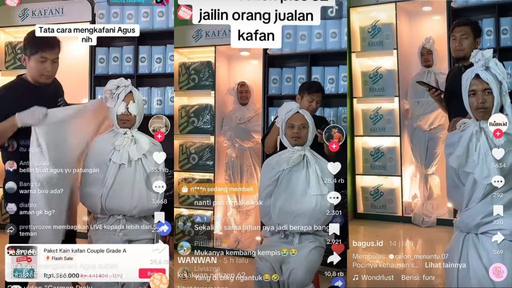 Sebuah akun TikTok bernama Kafani.id baru-baru ini viral karena menjual kain kafan secara live, dengan menampilkan model yang mengenakan kain kafan lengkap dengan penampilan mirip pocong.