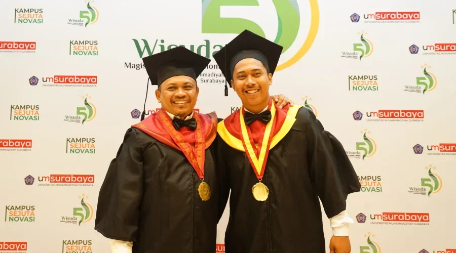 Kisah inspiratif datang dari kampus Universitas Muhammadiyah Surabaya (UM Surabaya). Wakil Ketua Pimpinan Daerah Muhammadiyah (PDM) Surabaya M. Arif An berhasil meraih gelar bersama putranya, Muhammad Zidan Sultan Attar, dalam sebuah momen wisuda yang penuh kebanggaan, Sabtu (31/8/2024).
